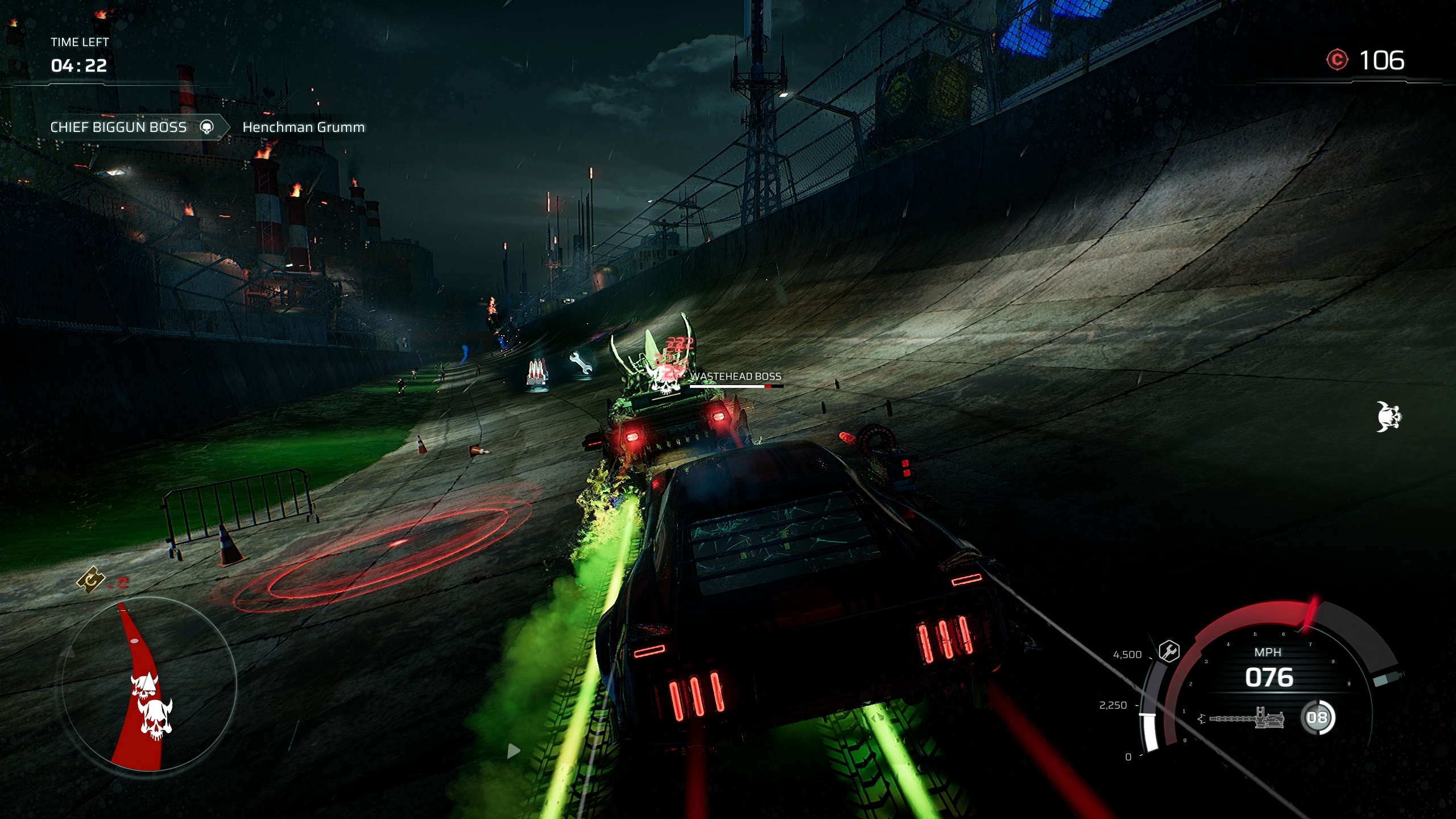Boss battles are also a mixed bag. While the races against tougher cars are fun, the battles against boss vehicles like Bullzerker get kind of boring and repetitive quite quickly. In the battles where you have a certain amount of time to destroy a boss, you’ll often find yourself having to slow down just so you don’t drive away from them. And, in many cases, it feels like the only true challenge is just how long it takes to actually destroy your opponent rather than the difficulty of the battle.